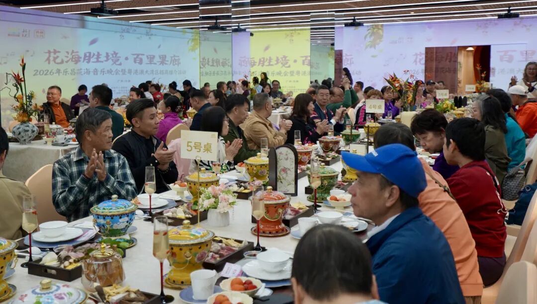 签约仪式后,乐昌特色“宫廷宴”与花海音乐晚会正式拉开帷幕。长桌上,新鲜的本地食材在精致的小火锅中香气四溢,北乡马蹄等乐昌特色农产品悉数亮相,让嘉宾沉浸式品味舌尖上的乐昌。